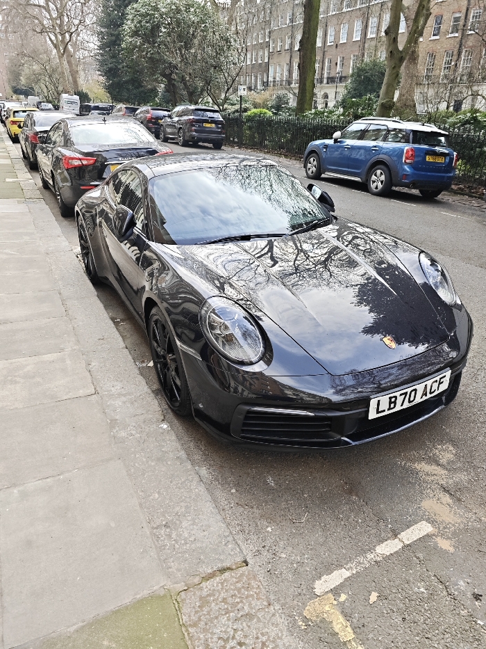 The image depicts a static scene on a paved street in London, United Kingdom, likely an affluent residential area characterized by garden squares and Georgian/Victorian architecture. In the foreground, a dark metallic grey or black Porsche 911 (992 generation) sports car is parked parallel to a light grey paved sidewalk on the right side of the road, facing away from the camera. Its front license plate, "LB70 ACF," is clearly visible, indicating a UK registration from late 2020. The car exhibits reflections of bare tree branches and the sky on its glossy hood and windshield. Black multi-spoke wheels are visible. Behind the Porsche, a black Maserati Ghibli sedan is parked, followed by several other parked vehicles, including a yellow car (partially obscured) and a dark SUV further down the street. Across the street, parked facing the camera, is a blue Mini Countryman with the license plate "ST68 BTX," and behind it, a dark Range Rover SUV with the plate "YN19 YSY." The road surface is asphalt, showing some wear, with faint yellow lines visible on the curb near the Porsche's front tire, indicating parking restrictions. A narrow strip of curb separates the road from the concrete sidewalk. In the background, on the opposite side of the street, are multi-story brick buildings typical of London townhouses, featuring numerous sash windows. In front of these buildings, a landscaped garden area or square is visible, enclosed by a dark fence, with mature trees, many of which are bare or sparsely leafed, suggesting a winter or early spring season. No individuals are present or engaged in any actions within the frame.