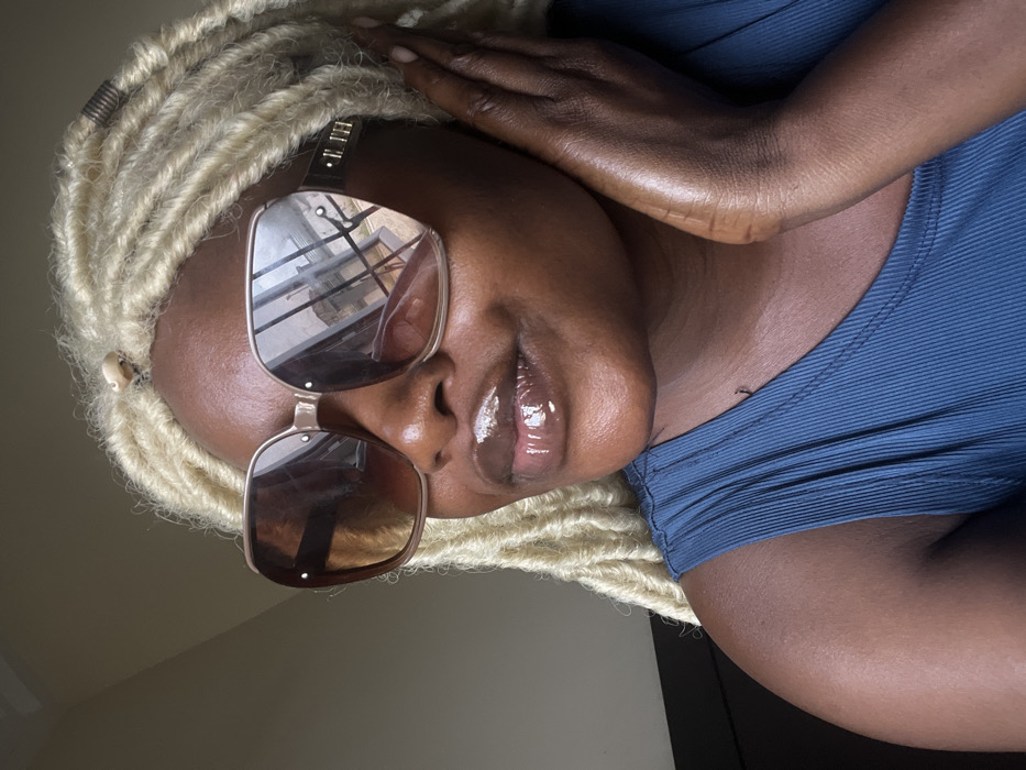 The image displays a close-up, chest-up portrait of an individual, likely female, with dark skin and blonde dreadlocks. The subject is wearing large, light-colored, square-framed sunglasses with dark, gradient lenses. Reflections on the sunglass lenses show exterior architectural elements, specifically vertical and horizontal bars or window frames against a lighter background. The individual's lips are slightly parted and coated with a high-gloss finish. Their right hand is raised, with fingers gently pressed against the right side of their jawline/cheek. The subject is wearing a dark blue or teal ribbed sleeveless top. The background is an out-of-focus, uniformly lit, light grey wall or interior surface, with a dark horizontal line visible in the lower-left corner. The location within the city of Gwarinpa, Nigeria, cannot be visually confirmed from the provided image.