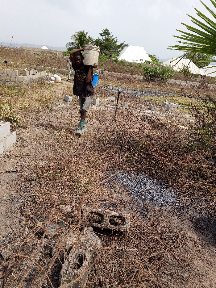 An outdoor scene in Zango-ndaji, Nigeria, depicts a young male engaged in labor on an undeveloped construction site under an overcast sky