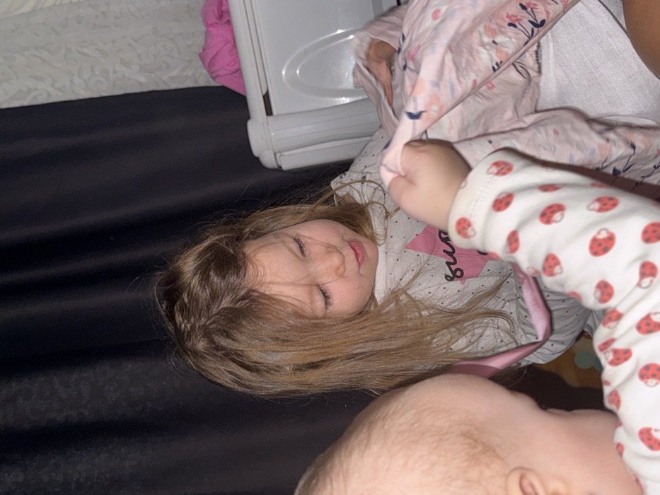 A young girl with long, light brown hair sleeps soundly, eyes closed. She's wearing a white and gray shirt with a pink design. Beside her, another child lies facing her, wearing a ladybug-patterned onesie. A light pink floral blanket partially covers the first girl. A white object with rounded edges is visible in the upper center, adding a sense of domesticity to the scene. The background appears to be a dark blanket or bedding.