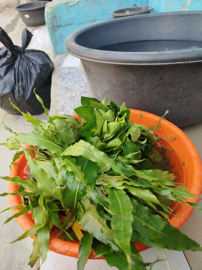 - "The scene, located in Mape, Nigeria, depicts a close-up view of a large quantity of fresh green leaves contained within an orange plastic basin" by FM-3EyKx2, licensed under CC BY 4.0