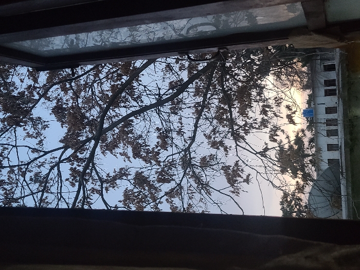 The image depicts an outdoor scene viewed from an interior vantage point, framed by a dark brown curtain on the left and a dark brown window frame with a reflective glass pane on the right. A large deciduous tree with numerous bare branches and sparse, dry brown leaves occupies the central and upper portions of the frame, silhouetted against a sky that transitions from light blue overhead to pale orange and yellow near the horizon, indicating either dawn or dusk. Below the tree line, a white, single-story building with a flat roof is visible. This building features multiple dark, rectangular windows or doors evenly spaced along its façade. A blue cylindrical water tank is situated on the building's roof on the right side, and a large, light-colored satellite dish is partially visible on the left side, positioned near the building. The immediate ground level below the building is indistinct. No individuals or dynamic actions are present in the scene. This view is situated in Quetta City Tehsil, Pakistan.