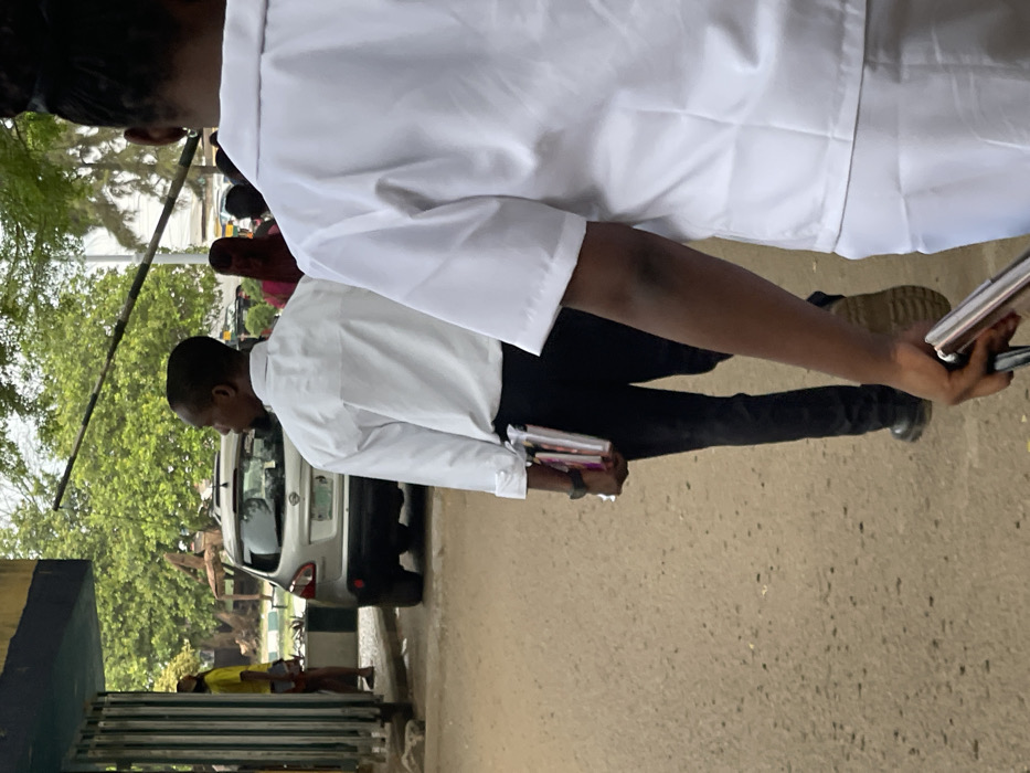 The image depicts a daytime scene on an unpaved, light brown pathway in the city of Uturu, Nigeria. In the immediate foreground, the right side of the frame shows the back and right arm of an individual wearing a white short-sleeved uniform shirt and white trousers, holding a silver metallic object in their right hand. In the midground, a male individual with dark skin and short dark hair is seen from a back-left perspective, walking forward. He is dressed in a long-sleeved white button-down shirt with rolled-up sleeves, black trousers, and dark shoes. He holds several books or binders in his left hand, with a dark wristband or watch visible on his left wrist. Behind these individuals, a silver Nissan Qashqai SUV with a sunroof is parked, facing away from the camera, on the left side of the pathway. Its license plate is not clearly visible. To the left of the parked vehicle, a person in a yellow short-sleeved shirt and light-colored shorts stands near a blue and yellow painted building structure and a gate. Further in the background, additional individuals are partially visible, one featuring reddish-brown hair. A dark-colored boom barrier extends horizontally across the upper midground. The environment is characterized by numerous green trees and bushes, indicating a vegetated setting under a bright sky.