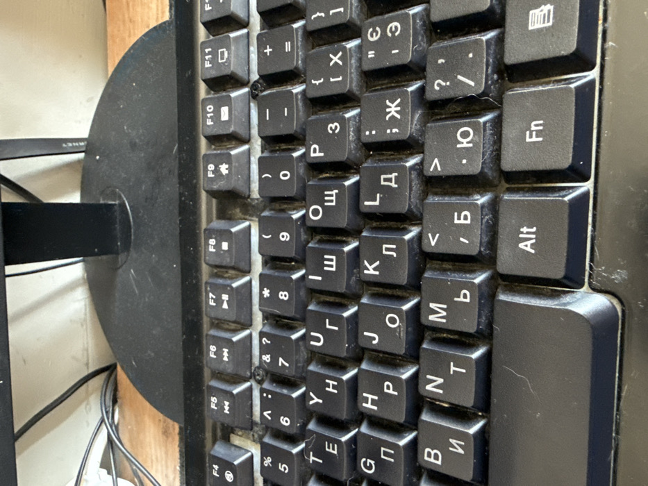 A close-up, top-down view depicts a black computer keyboard, situated on a wooden desk surface in the city of Urgench, Uzbekistan. The keyboard features a dual-language layout, displaying both Latin and Cyrillic characters on its keys. Visible keys include the function row from F4 through F11, numerical keys (5-0), and multiple alphanumeric keys. Key surfaces and the spaces between them show significant accumulation of dust and lint. Specific keys visible include 'Alt' and 'Fn' in the lower section, alongside various punctuation and special character keys. The upper background reveals a portion of a black monitor stand with a circular base, and several black and white electrical cables resting on the wooden surface behind the stand. No people are present, and no actions or interactions are depicted.