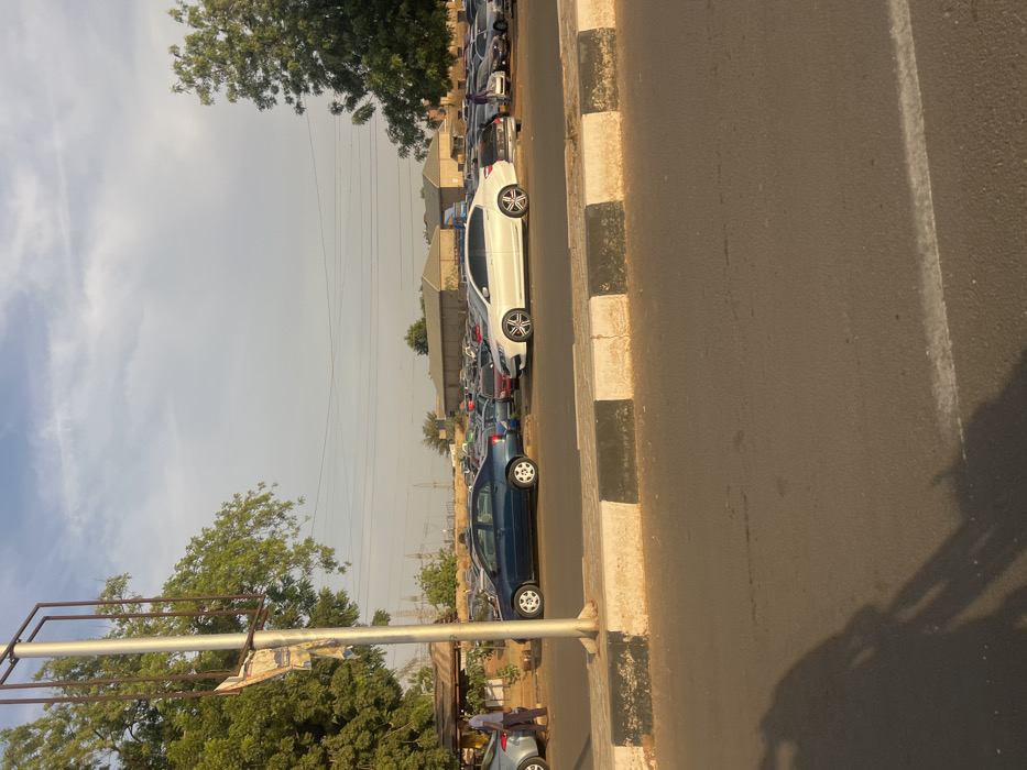 The image displays a daylight scene in Birnin Kebbi, Nigeria, focusing on a street and an adjacent car sales lot. In the immediate foreground, an asphalt road occupies the lower portion, showing a faint white line on the lower left. A concrete curb with alternating black and white painted sections separates the road from a dirt and gravel shoulder. A tall, grey metallic pole, featuring a rusted, empty rectangular frame with torn paper remnants, stands vertically on the left side of the shoulder. On the left side of the shoulder, a dark blue sedan is parked facing left. To its right, a prominent white sedan, identified as a Honda Accord with multi-spoke dark rims accented with red, is parked facing left. This white vehicle is positioned at the front of a vast, unpaved lot densely packed with numerous parked cars of various makes, models, and colors, extending towards the background. One individual, wearing a light-colored top and dark trousers, is observed walking leftwards on the dirt shoulder behind the dark blue sedan. Several other indistinct figures are visible further back within the car lot. The background features several low-rise, light-colored buildings, possibly warehouses or commercial structures, partially obscured by the parked vehicles. Utility poles and power lines are discernible in the distance. Lush green trees frame the scene on both the left and right sides. The sky is light blue with scattered white, wispy clouds. Elongated shadows are cast across the asphalt road from the left side, indicating sunlight from the right.