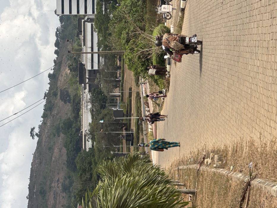 This image depicts an outdoor scene within the campus of Obafemi Awolowo University in Ile-Ife, Osun State, Nigeria. The time is daylight, under a bright, partly cloudy sky with visible overhead utility lines. The foreground features a light-brown, interlocking paver road, gently curving to the right. A dry, sparse grassy verge with a concrete curb borders the left side of the road, partially obscured by the fronds of several palm trees. Seven individuals and one motorcycle are present. In the left-midground, a person wearing a patterned blue and green traditional garment walks away from the camera on the paved road. Further along the road, two individuals walk on the left, and two others on the right. A black motorcycle with two helmeted occupants, the rider wearing a patterned top, travels away from the camera on the right side of the road, carrying items in a red bag. The motorcycle bears a license plate reading "08A N". Two additional individuals are visible standing near shrubbery on the far right side of the road. The mid-background reveals a manicured green lawn area featuring a dark statue on a pedestal and two flags—one Nigerian national flag and another dark-colored flag—on poles. Behind this, a complex of multi-story university buildings, characterized by white and grey facades with horizontal window bands, is prominent. A tall, multi-story building with dark vertical elements stands on the far right. The far background is dominated by a large, rocky hill with sparse vegetation, indicative of the local geology, under a diffuse sky.
