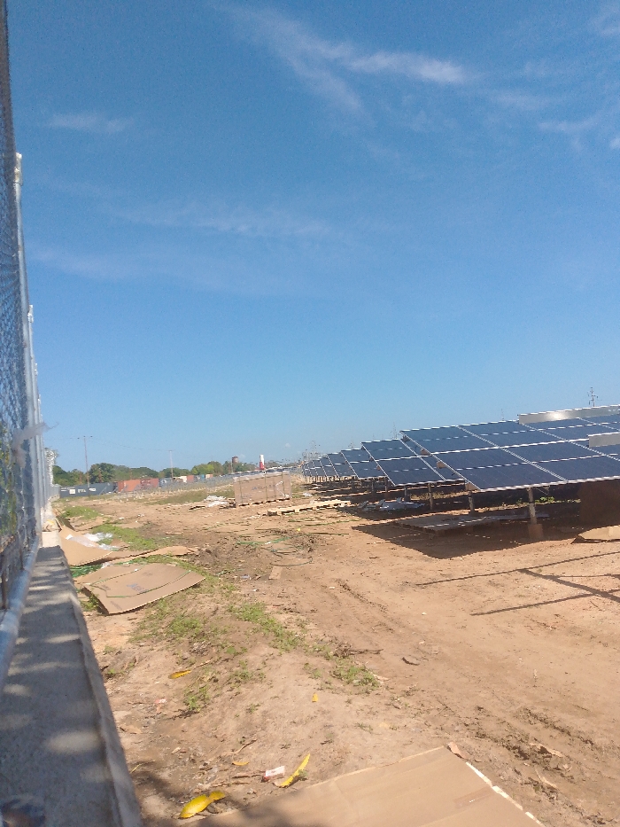 Rows of solar panels stretch across a dirt field under a clear blue sky. Cardboard debris litters the foreground and middle ground. A chain-link fence runs along the left edge of the frame. Distant shipping containers are visible, along with an industrial structure. The ground appears disturbed, suggesting recent construction or installation activity.