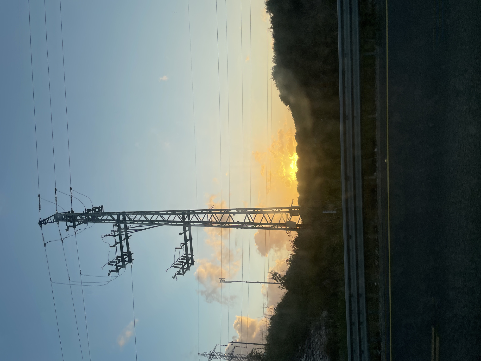 The image depicts an outdoor scene at sunset, likely located near Hod HaSharon, Israel, given the presence of power lines and infrastructure typical of an urban environment. A large, metal electricity pylon dominates the left side of the frame, with several high-voltage power lines extending across the view. The sun is setting behind a hill or a dense line of trees on the right side of the image, casting a warm, golden light that filters through the foliage. Part of a road and guard rail are visible on the right. A cell tower or another electrical tower is visible between the pylon and the hill. The sky is a gradient of blue and yellow, suggesting the time of day.