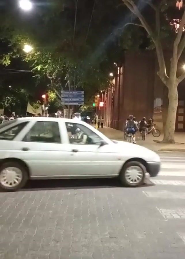 street scene at night. A silver car drives across the street. A group of cyclists in cycling gear, including vests and helmets, ride across the crosswalk. A person in a short denim dress and white sneakers walks into the street. Street signs and traffic lights are visible. There are people standing on the sidewalk in the background. Trees line the street. A brick building is visible on the right.