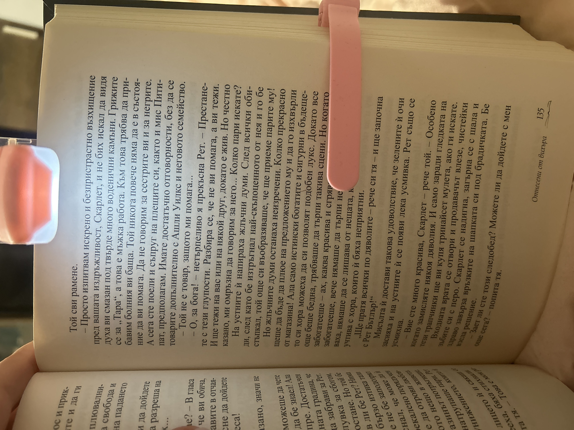 A close-up shot shows an open book with Bulgarian text, illuminated by a clip-on light with a pink bookmark attached. The book appears to be printed with a serif typeface. The pages are numbered '135', with a title beneath that reads 'Отнесени от вихъра'. The text discusses a character named Scarlet and involves dialogue between her and another character. The surrounding environment is blurred, with only the book in focus.