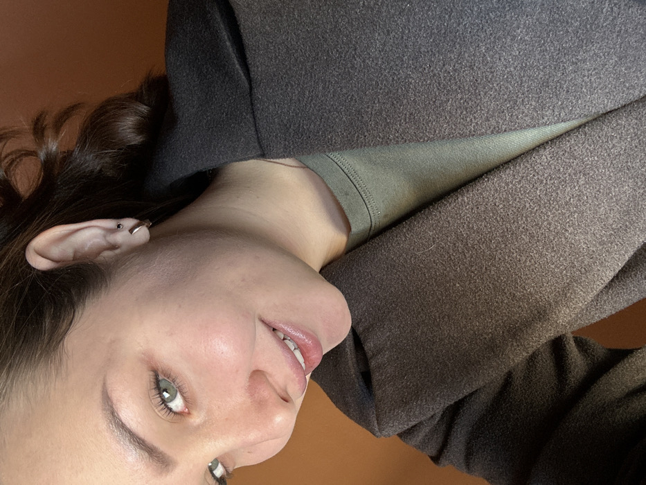 A close-up, angled portrait of a female subject, partially visible from the chest up, taken in Chaikovsky, Russia. The subject has fair skin, light green eyes, and dark brown hair pulled back. She exhibits a slight smile. She is wearing a dark grey or charcoal-colored textured coat over an olive green t-shirt. Her visible left ear is adorned with two earrings: a small black stud in the upper cartilage and a silver-colored huggie hoop in the lobe. The background is a plain, solid orange-brown wall.