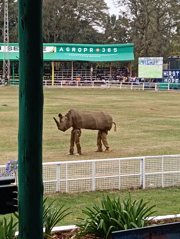 The image displays an outdoor event occurring at the Jamhuri Showground in Nairobi, Kenya. A two-person operated rhinoceros costume, brown and constructed from a boxy, textured material, stands prominently in the center of a large, expansive grassy field. The legs of the two individuals inside the costume are visible; the front person wears light-colored footwear, and the rear person wears dark brown footwear. The costume features a distinct head with a horn and ears, and a small tail. In the background, a long, open-sided grandstand structure with a green canopy features a prominent white banner displaying "AGROPRO365." Below this banner, numerous spectators are seated in multiple tiered rows, observing the field. To the right of the grandstand, a large outdoor screen displays an image, and partially visible text below it reads "HIRST HOPE." A dense line of trees forms the distant horizon behind the grandstand. The foreground is partially obstructed on the left by a thick, green-painted vertical post. A white metal fence with a grid pattern separates the immediate foreground from the main grassy field. Along the base of this fence, green leafy plants and a single purple flower are visible.