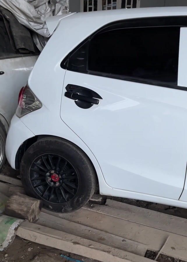 A white car is parked on a makeshift wooden platform in front of a building with a row of small windows at the top. The car has black tinted windows and black door handles. The rear wheel is resting on a small piece of wood. A yellow plastic container is on the platform near the car. The car next to it is covered by a tarp.
