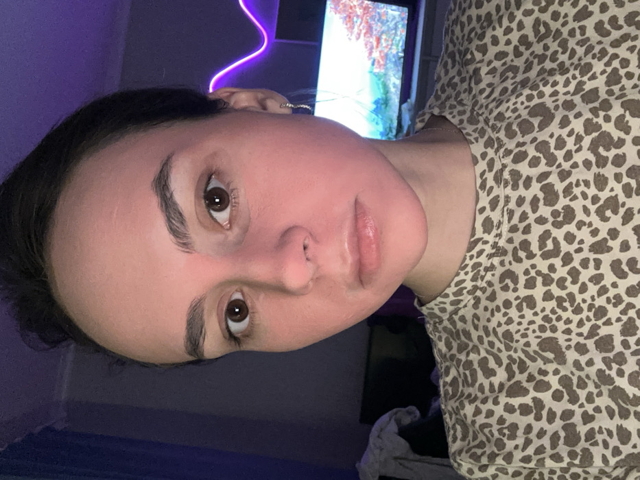 The scene is an indoor, dimly lit residential setting in Trudovaya, Russia. A single adult female subject is centered in a close-up, facing directly towards the viewer. She has dark hair pulled back and brown eyes, maintaining a neutral expression. Her facial skin presents a widespread pinkish-red hue, notably contrasting with lighter, near-white areas around the upper eyelids and under-eye regions. She is wearing a light-colored, short-sleeved top with a dark brown leopard print. A small, silver-colored earring is present on her right ear, and a thin silver-colored chain is around her neck. The background features a dark blue curtain on the left, with a light-colored garment draped over an object below it. On the right, a purple neon light fixture displays a wavy pattern above a large electronic screen exhibiting a multicolored image. The overall lighting is artificial.