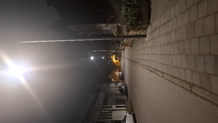 A street at night is illuminated by sparse streetlights. Fog obscures buildings and cars. On the right, a brick sidewalk runs parallel to the road. The scene is dark and misty, limiting visibility and casting a cool tone over the urban environment. Streetlights cast a halo effect in the humid air.