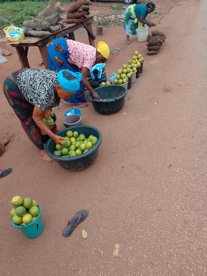Three African women sell produce on the side of a road. One woman is near yams on a wooden table, while the other two women are sorting green citrus fruits into containers. A large, dark-colored basin is filled with the citrus fruit in the foreground. A small bucket is filled with the citrus fruit nearby. A sandal lays discarded near the bucket and another one is next to the large bin of citrus fruit.