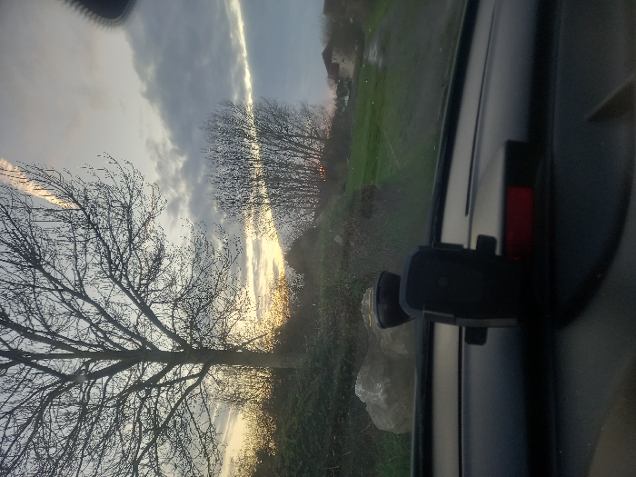 View from inside a car showing a landscape at sunset. Bare trees are silhouetted against a sky streaked with clouds and a band of sunlight. A grassy field is partially visible beyond a hedge. A car phone holder is attached to the dashboard. The scene is viewed through the windshield, which slightly distorts the clarity.