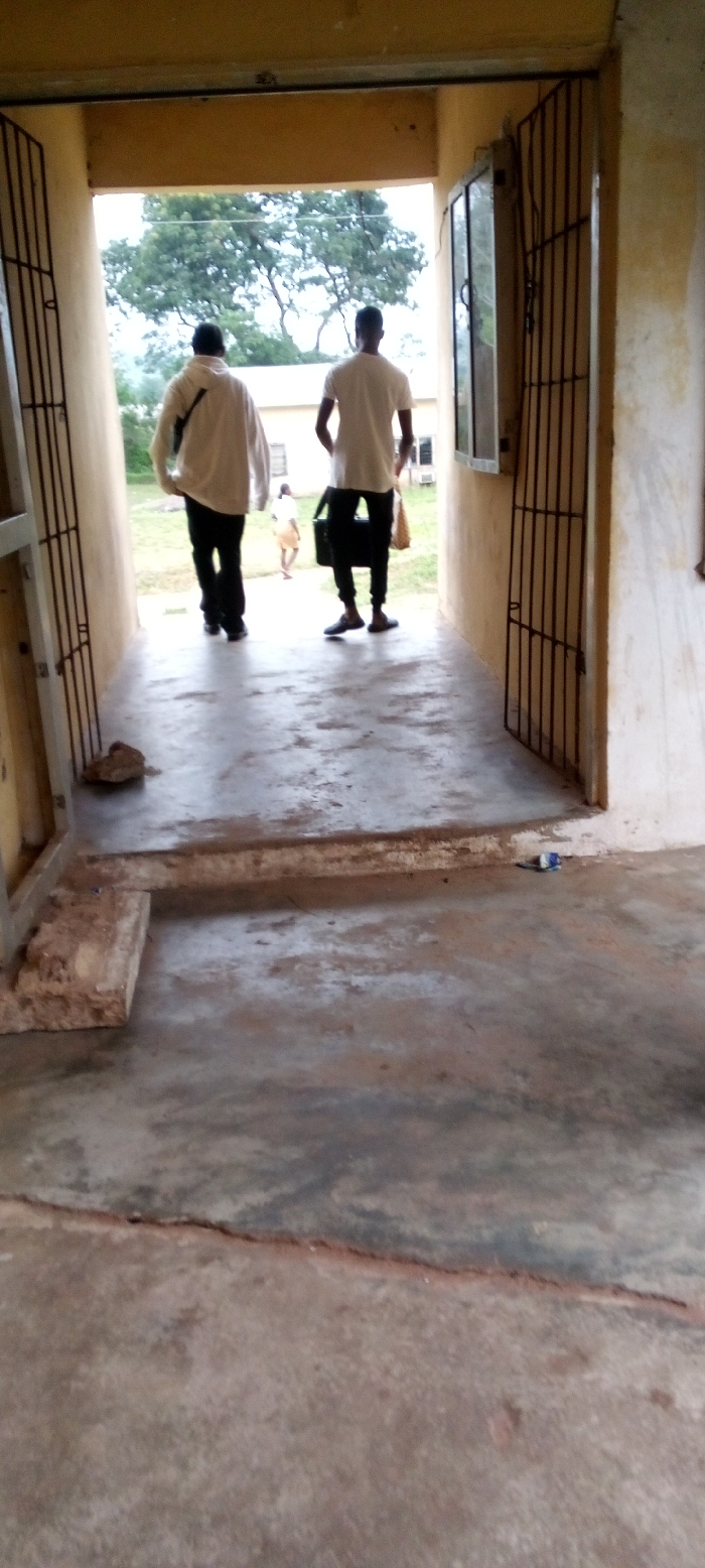 view from inside a building, likely a school or office, looking out towards an open courtyard. Two men wearing white shirts and black pants are walking away from the camera towards the courtyard. There are trees and a building in the background. There is a metal gate to the left of the doorway and another metal gate to the right, and a smaller door in the background to the left. The floor is concrete and there is a small step up from the hallway to the courtyard. The image was taken in Okigwe, Nigeria, at the coordinates 5.825 latitude and 7.393 longitude. The camera appears to be positioned at ground level.