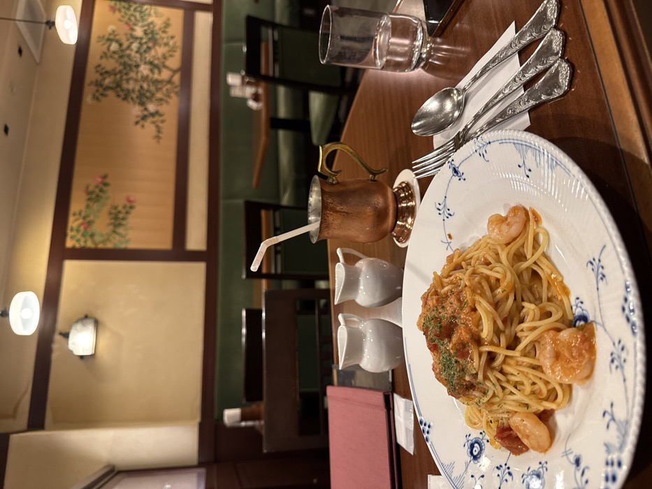 A close-up view depicts a prepared meal set on a dark brown wooden table within a restaurant in Shibuya, Japan. The central subject is an oval white plate, adorned with a blue floral pattern along its rim, holding a portion of spaghetti pasta with a red tomato-based sauce, garnished with green herbs, and featuring several peeled shrimp. To the right of the plate, ornate silver-colored cutlery, including a fork, spoon, and butter knife, rests on the table. Further objects on the table include two small, white ceramic pitchers positioned behind the plate, and a copper mug with a handle containing a white plastic straw, placed on a white coaster. A clear glass of water is situated to the right of the copper mug, with a dark smartphone partially visible next to it. A red menu folder lies on the left side of the table. The background shows the restaurant's interior with warm lighting. Dark wooden chairs and tables are arranged, accompanied by a long, dark green upholstered booth running along the back wall. The wall itself is decorated with light beige panels framed by dark wood, featuring a prominent decorative panel depicting stylized trees with pink blossoms. Overhead, two white, dome-shaped ceiling lights illuminate the scene, with an additional wall-mounted light visible on the left. No people are present in the frame.