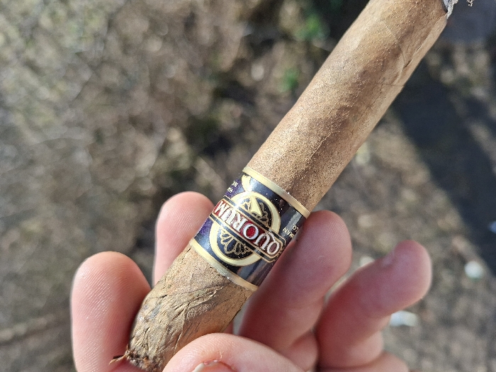 - "A human hand, primarily showing the thumb and index finger, holds a single "QUORUM" brand cigar horizontally in the foreground" by FM-eXIDh1, licensed under CC BY 4.0