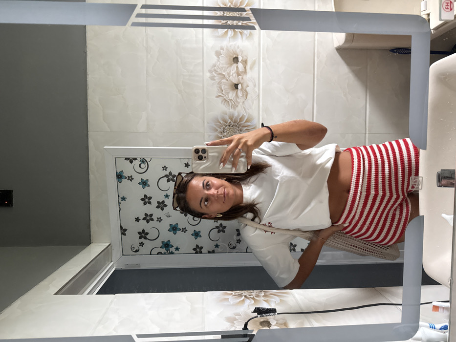 A young woman takes a mirror selfie in a bathroom. She wears a white t-shirt, red and white striped shorts, and gold hoop earrings. Her sunglasses are perched on her head. The bathroom features patterned wall tiles, a door with a floral design, and a modern sink area. The lighting is bright.