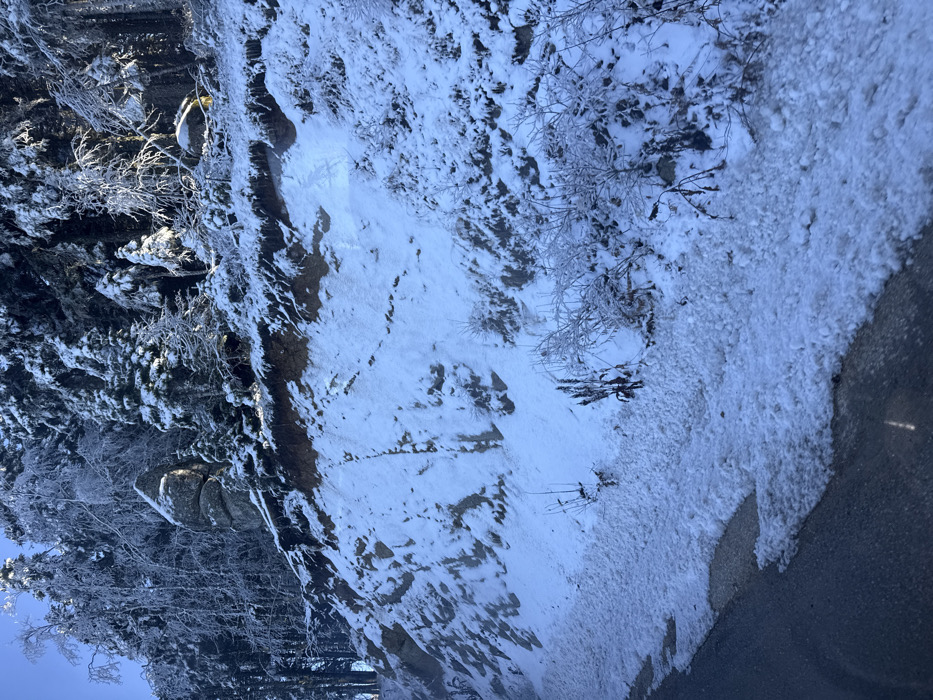 This image displays a snow-covered mountain roadside scene in Bursa, Turkey, specifically within the Uludağ mountain region. In the foreground, the edge of a dark asphalt road is visible in the lower left quadrant, partially covered by a bank of accumulated, granular snow and slush. Adjacent to the road, a steep, snow-covered embankment rises, revealing sections of exposed brown earth and rock through the snow. Several bare bushes and dried plants, some encrusted with ice, protrude from the snow on this slope. Above the embankment, a dense coniferous forest covers the upper slope and background. The pine and fir trees are heavily laden with snow and ice, with sunlight illuminating their frost-covered branches. A distinctive, vertically stacked rock formation is visible amidst the trees on the upper left portion of the slope. The scene is illuminated by clear daylight, casting shadows and highlighting the icy conditions. No individuals, animals, or vehicles are present.