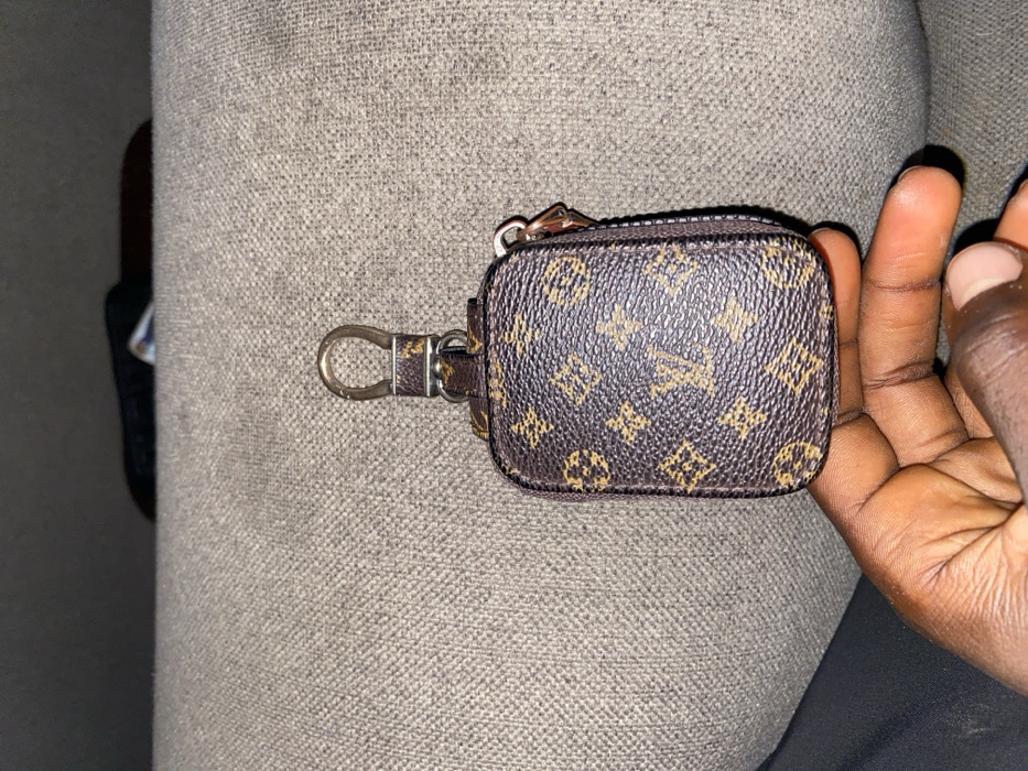 A dark-skinned human hand holds a small, rectangular brown pouch featuring a repeating gold-colored monogram and floral pattern, consistent with Louis Vuitton branding. The pouch has a gold-colored metal swivel clasp at its top and a zipper along its right edge. The hand grips the lower portion of the pouch. The background consists of a textured, light brown or taupe fabric surface, likely upholstery. A dark, out-of-focus object is visible in the upper background, resting on a darker surface behind the fabric. The scene is observed within a private setting in the city of Jos, Nigeria.