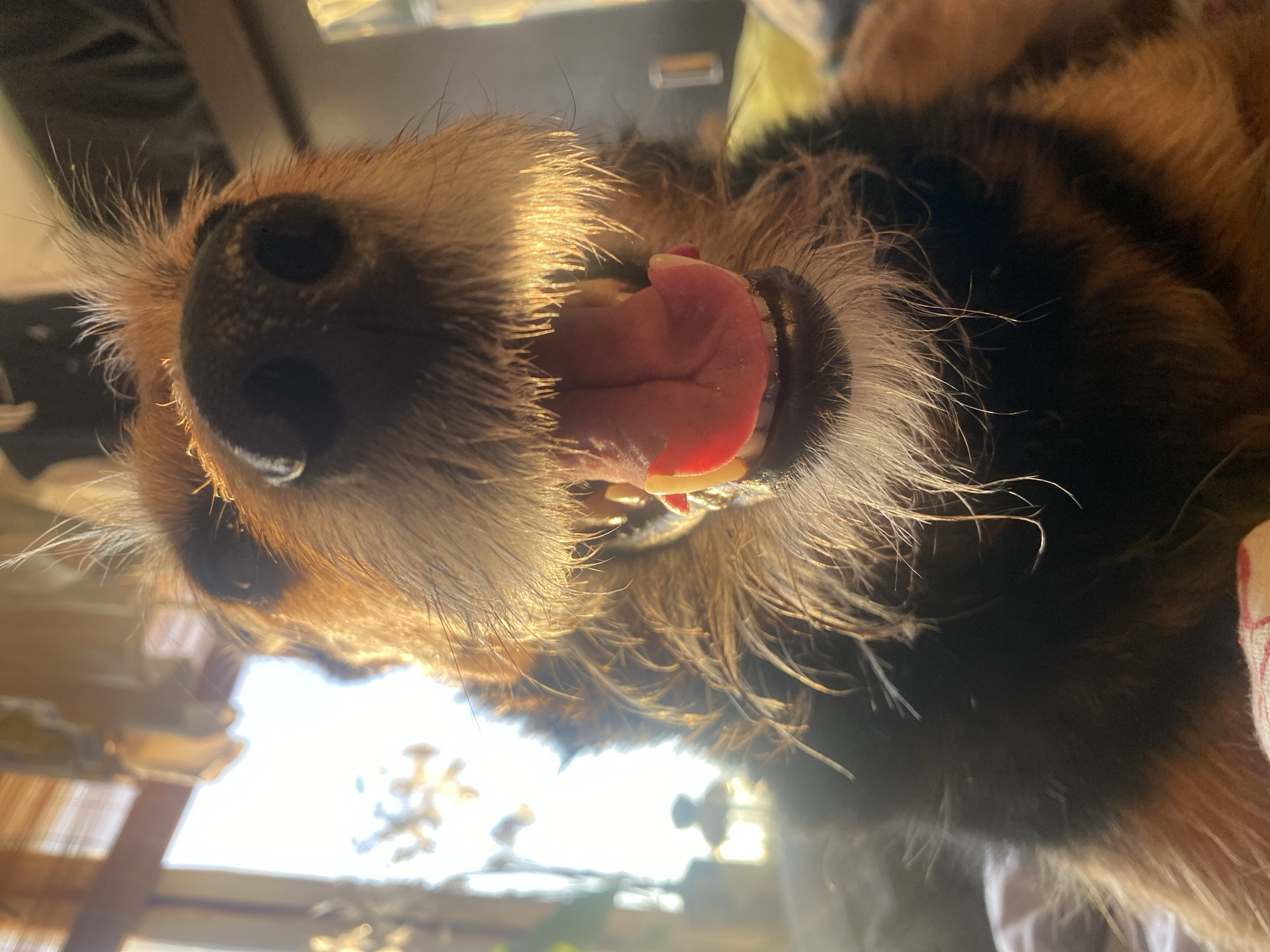 A low-angle, upward shot depicts a dog with brown and black fur. Its mouth is open, revealing a pink tongue and teeth. The dog's nose is prominent, positioned above the open mouth. Light shines from behind the dog, creating a halo effect around its face and fur. The background appears to be a blurry outdoor or semi-outdoor setting. There is no information about the location in Khimki, Russia.