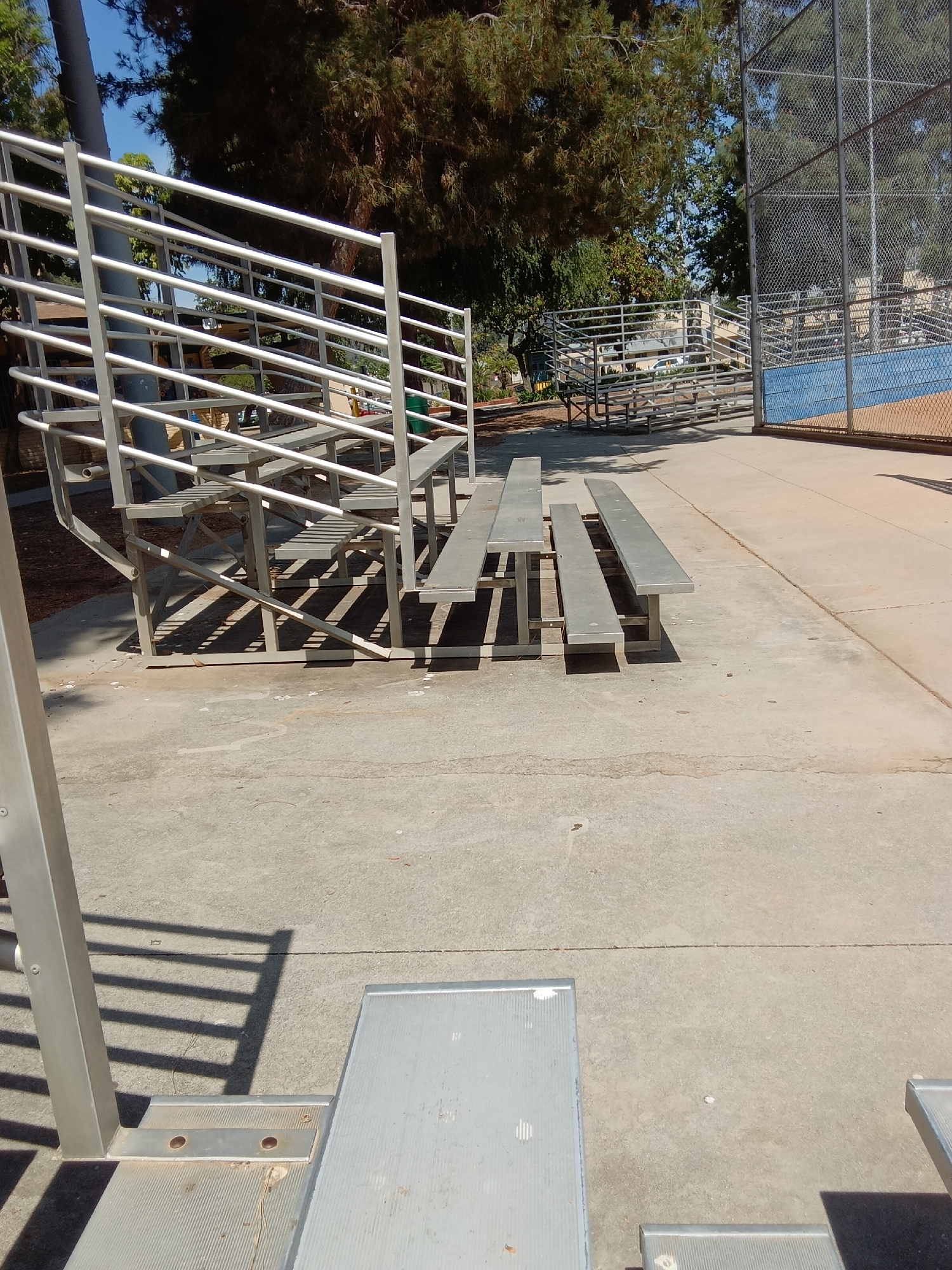 The image displays an unoccupied outdoor recreation area, specifically a sports facility in East Los Angeles, United States. The scene is illuminated by bright sunlight, casting distinct shadows. Multiple sets of multi-tiered aluminum bleachers are present on a light gray concrete ground. A large set of bleachers with an aluminum railing occupies the left side of the frame, with another smaller set positioned to its right. In the background, behind a tall chain-link fence, additional bleachers are visible. The lower portion of the chain-link fence features a blue material or screen. Dense green foliage from trees is visible along the background and upper left. The concrete ground exhibits minor cracks and scattered debris. No individuals, actions, or interactions are depicted.