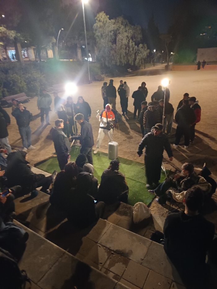 The image portrays an outdoor nighttime gathering in a public space within l'Hospitalet de Llobregat, Spain, characterized by unpaved ground, trees, and urban elements