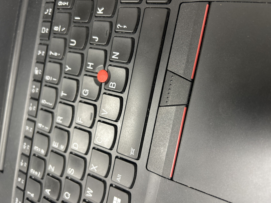 The image displays a close-up, high-angle view of the keyboard and touchpad area of a black laptop computer. The keyboard features an AZERTY layout, typical of French-speaking regions, with keys such as 'A', 'Z', 'E', 'R', 'T', 'Q', 'W', 'S', 'D', 'F', 'G', 'H', 'B', 'N', 'V', 'C', 'X', and 'Alt' clearly visible. A distinctive red TrackPoint pointing stick is situated between the 'G', 'H', 'B', and 'N' keys. Below the spacebar, three dedicated TrackPoint mouse buttons are present, marked by red accent lines, with the middle button featuring five small tactile dots. A dark, rectangular touchpad surface extends below these buttons. Minor dust accumulation is visible on the keycaps and touchpad surface, indicating typical use. No individuals, actions, or interactions are present in the scene. The environment is indoors, but the image contains no specific visual identifiers to determine the precise location within the city of Saint-Étienne, France.