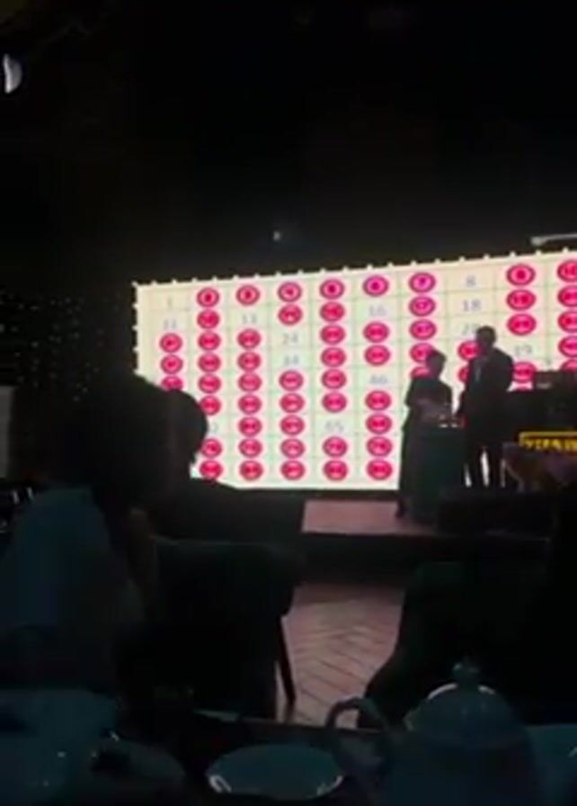 n indoor event taking place in a dimly lit venue with decorative lights, including a disco ball. There are several tables occupied by people sitting and engaging in conversation. In the background, a large digital screen displays a grid of numbers, resembling a bingo or lottery board. Two individuals, a man and a woman, are standing in front of the screen, presumably hosting or presenting something related to the displayed numbers. The people in the foreground are partially obscured, but it is possible to see plates, teacups, and a teapot on their tables. The atmosphere seems relaxed and social.
