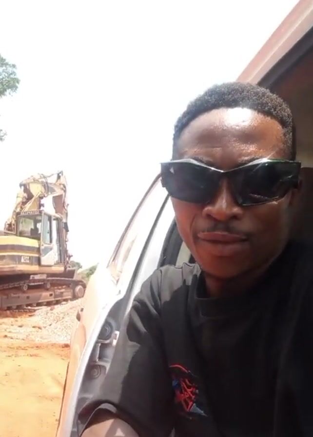 From the perspective of someone sitting inside a parked white vehicle, the video shows road construction in progress on a dirt road. Outside the vehicle, a yellow CAT excavator sits on the edge of the road, apparently having been used to move piles of reddish-brown dirt. The background shows some buildings and trees under a blue sky. In one part of the video, a person in yellow pants walks past the vehicle. A man in sunglasses is sitting inside the vehicle.