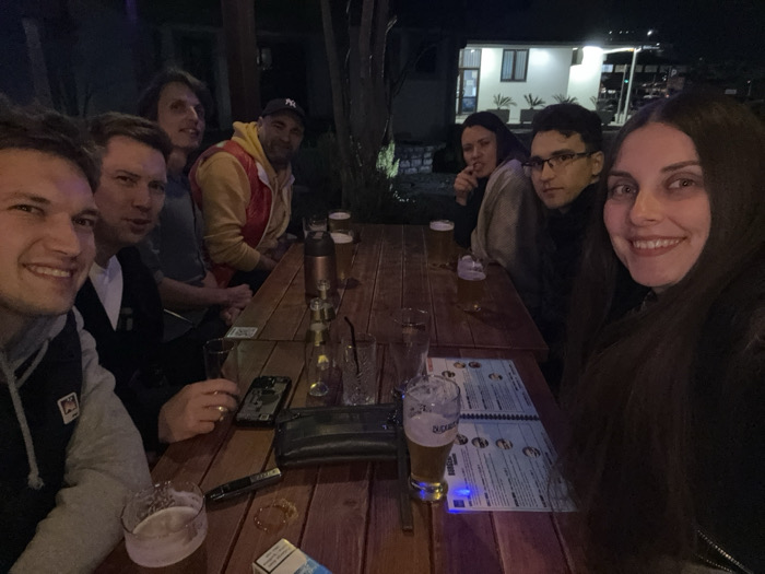 Eight individuals are seated at a long, dark wooden plank table in an outdoor or semi-outdoor establishment at night, illuminated by artificial warm light