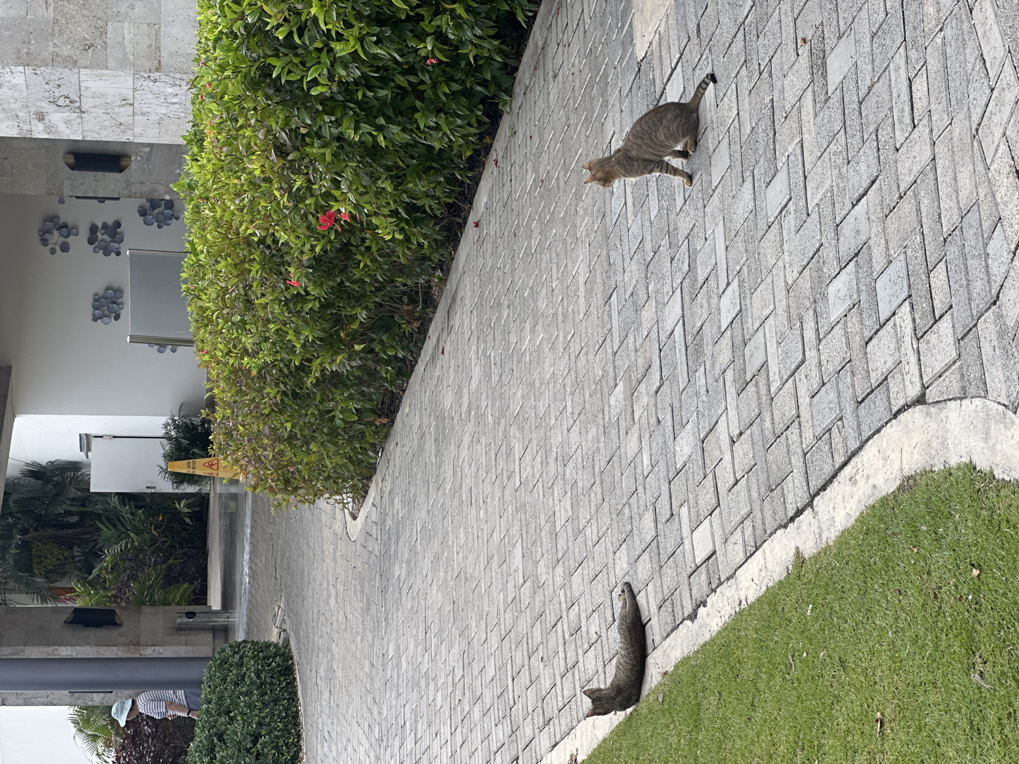 The image depicts an outdoor paved pathway within a landscaped area in Higüey, Dominican Republic, characteristic of a resort or hotel environment. The pathway is constructed of light grey rectangular pavers laid in a repeating pattern. Two tabby cats are present on the pathway. One cat is lying prone near the left edge of the path, adjacent to a strip of green grass, with its head oriented away from the camera. The second cat is sitting upright further along the path on the right side, facing towards the right. The pathway is bordered on the left by a strip of green grass and on the right by a dense, neatly trimmed green hedge containing several small red flowers. In the background, a person wearing a striped shirt and a light hat is partially visible walking past a large stone-clad architectural pillar on the left. Further back, white building structures are visible, featuring abstract metallic wall art and a dark, cylindrical wall-mounted light fixture. A metallic trash receptacle is situated near the pillar, and a yellow "CAUTION WET FLOOR" cone is positioned near a partially open white door in the background. Tropical vegetation is visible behind the structures.
