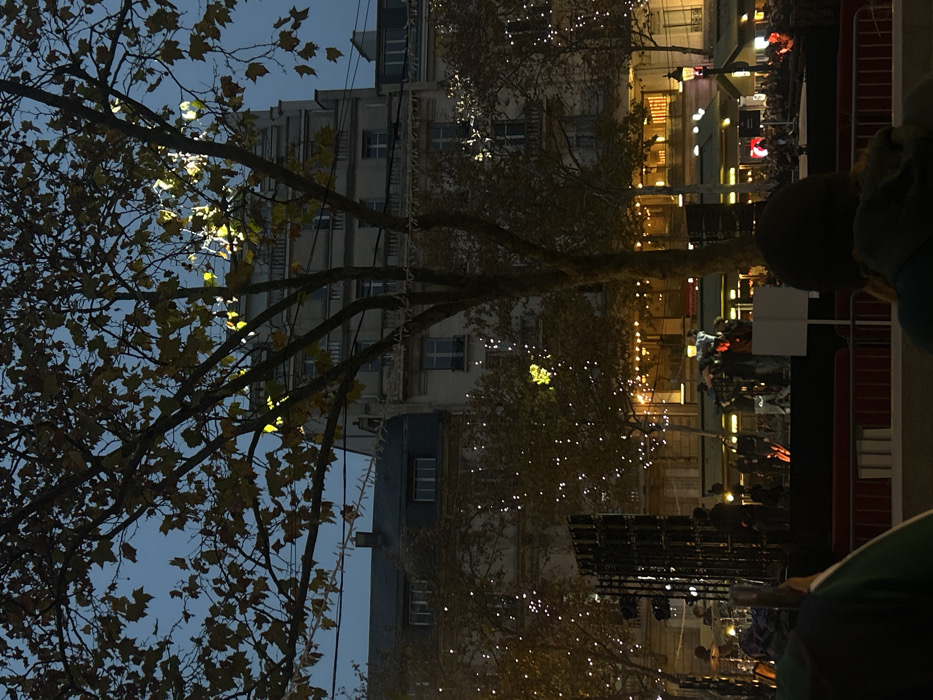 The image depicts an outdoor evening scene in an urban environment, specifically a public square or wide boulevard in Paris, France. The sky is dark blue, indicating dusk or early night, with artificial lighting illuminating the scene. In the foreground, two individuals are visible from behind, facing away from the viewer. The person on the left holds a dark object resembling a smartphone, suggesting recording. They are positioned behind a red metal barrier. The midground features a temporary outdoor stage setup. Multiple figures, appearing to be musicians or performers, are visible on the stage with instruments, including a drum set on the left. Large dark structures, likely part of the stage's lighting or sound rig, flank the stage. Behind the stage, a crowd of spectators is gathered, extending into the background. Dominating the central midground and partially obscuring the background is a large deciduous tree with sparse, light-colored autumn leaves. Some leaves are brightly illuminated by an unseen light source. Several other trees in the background are decorated with small, white string lights. The background consists of multi-story Haussmannian-style buildings with numerous windows and balconies, characteristic of Parisian architecture. The ground floor of these buildings reveals illuminated storefronts or cafes with warm yellow lighting. A classic Parisian streetlamp is visible on the far right.