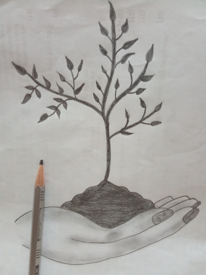 The image displays a photograph of a pencil drawing on a white sheet of paper. The drawing, rendered in shades of graphite, depicts a stylized sapling or small tree with a slender trunk and numerous branches adorned with small, pointed leaves. This tree emerges from a mound of soil, which in turn rests within the open palm of a human hand. The hand is drawn with five fingers, including visible fingernails, and exhibits shading to suggest contour and depth. A light grey pencil with a sharpened lead tip and an orange top segment is positioned vertically on the left side of the photograph, partially overlapping the lower portion of the drawn hand and the bottom left edge of the paper. The paper itself appears to be a page with faint, underlying text or numbering visible through its surface. The scene is a two-dimensional artistic representation captured in a photographic medium, providing no inherent geographical data or context to determine a specific location in the city of Quetta, Pakistan, or elsewhere.