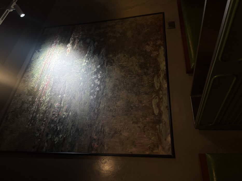 A framed landscape painting dominates the scene, illuminated by a bright spotlight