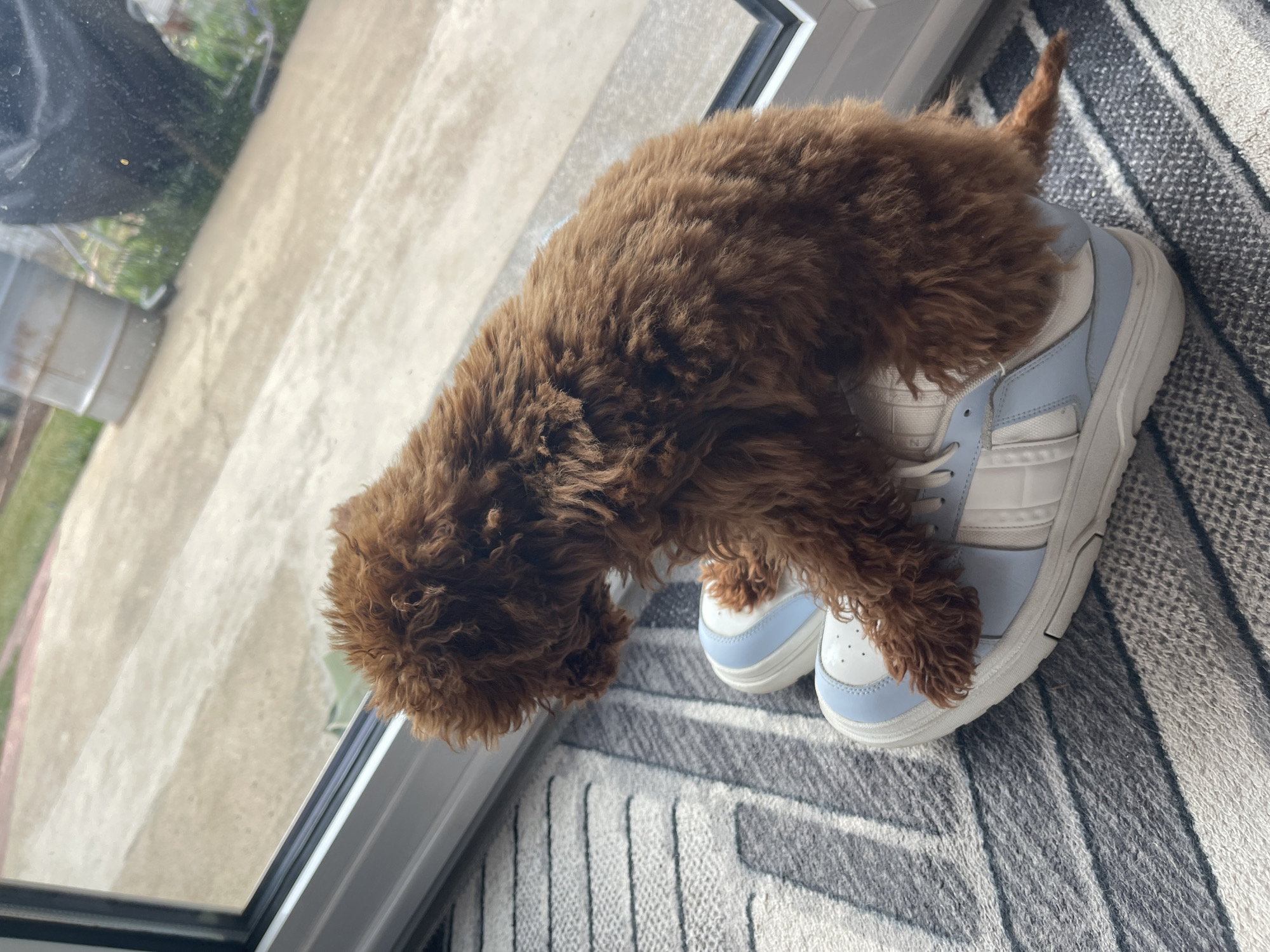 A reddish-brown, curly-haired puppy is positioned on a pair of light blue and white athletic shoes, sitting on a striped rug near a glass sliding door or window