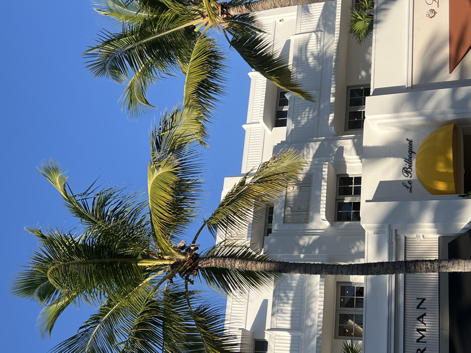 A bright sky serves as backdrop for tropical scenery. Two palm trees are prominent, their green fronds reaching upward. A white art deco building stands beside the trees, adorned with multiple windows and decorative architectural details. A yellow awning marks the entrance to "Le Bilboquet," its name displayed clearly. The bottom of the building reads "FORMAN". The scene evokes a sense of tropical elegance and architectural beauty.