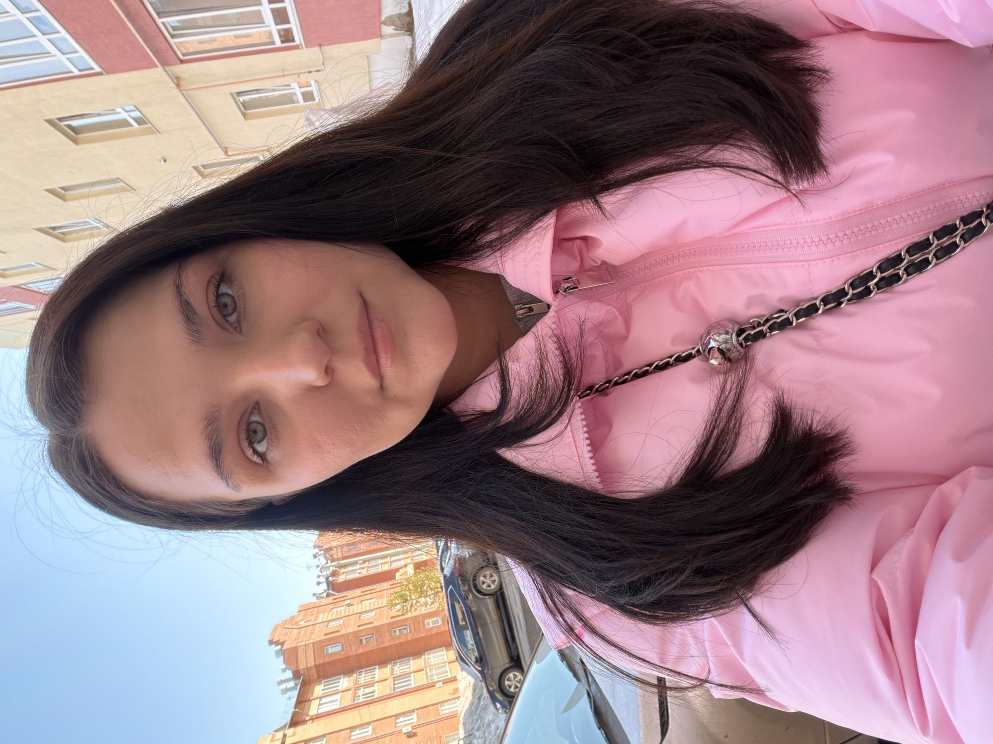 A young woman with dark hair and fair skin wears a pink puffer jacket with a chain strap, likely from a purse or bag, visible. The background features an urban setting with multi-story buildings. Based on architectural styles and building colors, the location is Chaikovsky, Russia. A car is parked on the street, reflecting the sky. The sky is clear and blue.
