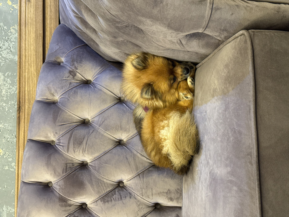 - "A small, orange-brown Pomeranian dog with fluffy fur is observed sleeping curled up on a light grey, tufted velvet sofa" by FM-gH6Fy1, licensed under CC BY 4.0