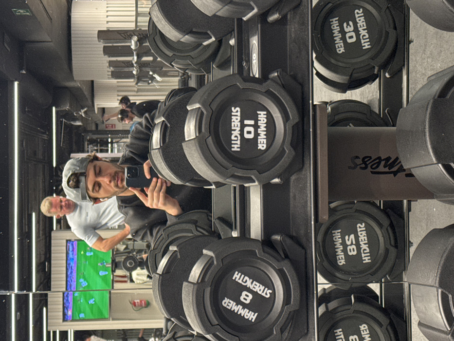 man taking a selfie in a gym mirror, with rows of dumbbells labeled "Hammer Strength" visible