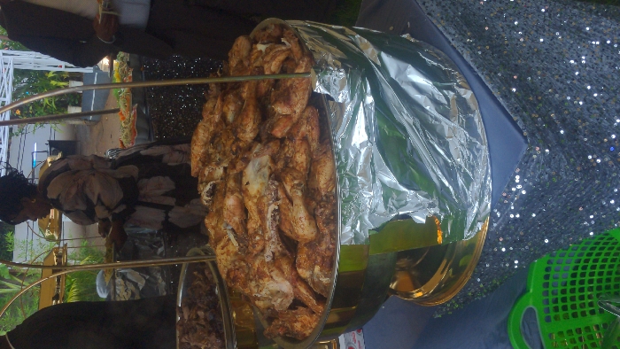 The scene depicts an outdoor buffet line at an event in Kondeni, Tanzania. In the immediate foreground, a large, round, metallic serving dish, supported by a gold-colored base and with its lower section wrapped in aluminum foil, is filled to capacity with numerous pieces of cooked, seasoned chicken. This dish rests on a table covered with a dark, sequined tablecloth. A green plastic basket is partially visible on the lower left. To the left, a woman with dark, styled hair, wearing a patterned dress, stands holding a plate, appearing to serve herself from another food container. To the far right, a man in a dark suit jacket and light shirt is partially visible, holding a plate, positioned near additional serving platters containing salads and vegetables. The background shows green foliage and a white-framed outdoor structure.