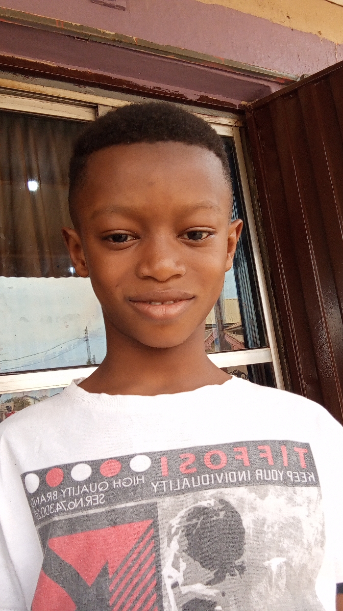 A young male, likely an adolescent, with dark skin and a short, dark haircut, is positioned centrally, facing the camera with a slight smile