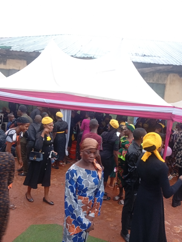 An outdoor gathering is depicted in Akpaka Forest Reser, Nigeria. A large group of individuals, primarily adults, are present under and around white event canopies adorned with pink and white fabric trim. The ground is a reddish-brown earth, appearing wet, possibly from recent rain. In the background, a building with a corrugated metal roof is visible. In the foreground, a woman wearing a long-sleeved dress with blue, white, and brown geometric patterns and a brown headscarf stands, facing slightly left, with her hands clasped. To her left and slightly behind, another woman in a black long-sleeved dress and a yellow beret walks towards the left, holding a black handbag and possibly a small device in her other hand. Numerous other people are distributed throughout the scene, many wearing black attire, with some also wearing yellow berets or headwraps. One woman, with her back partially to the camera, wears a black dress and a yellow headwrap. Individuals are standing, conversing, and moving within the event area. A small patch of artificial green grass is visible on the ground near the foreground. The sky is overcast, providing diffused lighting to the scene.