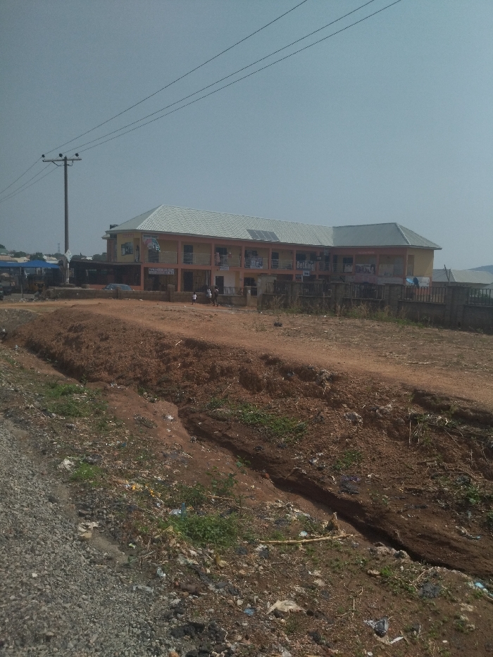 two-story building with a green roof in the city of Abuja, Nigeria, at the coordinates 8.913 latitude and 7.563 longitude. The building is made of concrete and has a fence in front of it. There are a few trees and bushes around the building. In the foreground, there is a dirt road, with a ditch on the side. The ditch is filled with trash and debris. There are a few people walking in front of the building, and there is a truck parked on the road to the left. There are several power lines going overhead. The sky is clear and blue.