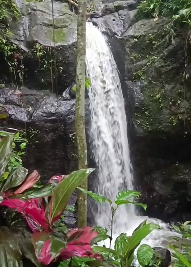 waterfall cascading down a rocky cliff face in a lush, green environment. The water is white and turbulent as it falls. The surrounding area is covered with plants, including some with vibrant red and green leaves. A thin tree trunk stands in the foreground, partially obscuring the view of the waterfall. The environment appears to be a tropical forest or jungle.