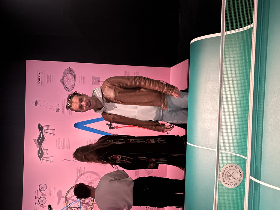 This image depicts an indoor exhibition space within the Cité des Sciences et de l'Industrie, located in Parc de la Villette, Paris, France. In the foreground, a teal-green display table, resembling a ping-pong table with a net, occupies the lower third of the frame. A circular sign bearing the text "NE PAS TOUCHER / DO NOT TOUCH" and a white hand icon is visible on its surface. Three individuals are positioned behind this table. Centrally, a light-skinned male with short, styled hair and sunglasses resting on his head is smiling directly at the camera. He is dressed in a light grey hooded sweatshirt, a brown leather jacket, and light blue jeans. To his left, a person with long, light-colored hair is seen from the back, wearing a long, dark coat adorned with red and black geometric patterns, seemingly observing the exhibition wall. Further to the left, another person, also seen from the back, wears a white long-sleeved shirt and dark trousers, similarly observing the background display. The background is dominated by a large, brightly lit pink wall featuring numerous black line diagrams and accompanying French text. Visible diagrams include a classic bicycle, a wavy ping-pong table design, a stylized human leg with a shoe, and a circular object. A prominent "SORTIE" (Exit) sign is visible in the upper right portion of this pink wall. A large, abstract blue geometric shape is partially visible behind the central male figure. The rightmost section of the background consists of a dark, unlit wall. The scene is well-lit, characteristic of a museum or gallery setting.
