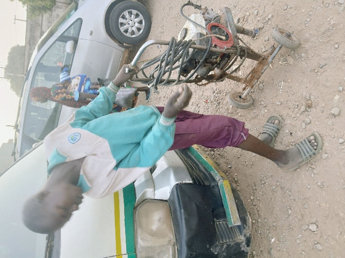 A young individual in a light-colored sweatshirt and maroon shorts stands next to a white vehicle, positioned in front of a rusty metal frame on wheels attached to a dark, complex machine with wires. The ground is covered in dirt and rocks. In the background, a silver car and a person in colorful clothing are visible. The person is wearing sandals.